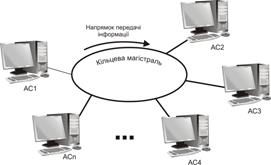 Кільцева мережа (рис. 2.19) характеризується наявністю замкнутого односпрямованого каналу передачі даних у вигляді кільця або петлі. У такому разі інформація передається послідовно між адаптерами абонентських систем, поки не буде прийнята абонентською системою-одержувачем. Керування роботою кільцевої мережі здійснюється централізовано — спеціальною моніторною системою або децентралізовано — через розподіл функцій керування між усіма абонентськими системами.