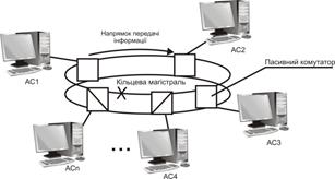 На рис. 2.22 зображено типову структуру кільцевої мережі з використанням нерозривного комутатора, вихідні контакти якого є нормально замкнутими, внаслідок чого утворюється внутрішнє кільце передачі інформації.