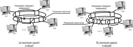 Один із значних недоліків кільцевої мережі — вихід її з ладу у разі розриву кільця — найчастіше усувається шляхом використання «подвійного» кільця. Для цього до локальної мережі вводять додаткові лінії зв’язку і пристрої реконфігурації. На рис. 2.20 показано схему перемикання з одного кільця на інше у разі виходу з ладу одного із сегментів кільця.