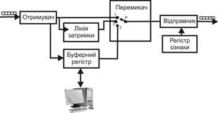 Взаємодія абонентської системи з середовищем передачі здійснюється за допомогою блоку доступу (рис. 2.28), до складу якого входять: утримувач, лінія затримки, перемикач, відправник і буферний регістр. Приймач водночас із відновленням фізичних параметрів вхідних сигналів здійснює попередній аналіз кадрів даних, що надходять. Якщо кадр адресований даній абонентській системі, то його копія заноситься в буферний регістр для наступної передачі в абонентську систему. Кадр даних через перемикач (Р) передається в передавач, у якому до нього додається службова інформація про стан абонентської системи і результат прийому даних. Лінія затримки служить для збереження інформації, що надходить з мережі, на час передачі кадру даних з абонентської системи.