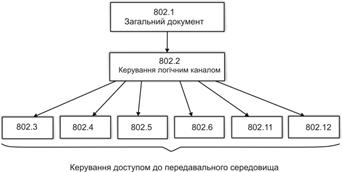 За допомогою цих стандартів були визначені: основна термінологія, архітектура і протоколи двох нижніх рівнів еталонної моделі OSI. Структуру стандартів IEEE-802 зображено на рис. 1.20.