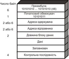 Протокольним блоком даних підрівня керування доступом до передавального середовища є кадр підрівня, за допомогою якого здійснюється обмін інформацією між абонентськими системами мережі. Структуру кадру даних стандарту IEEE-802.3 зображено на рис. 3.1. Кадр починається преамбулою, що відповідає за побітову синхронізацію передачі і приймання даних мережевим контролером. З цією метою в преамбулі шість разів повторюється байт 10 10 10 10. На початок надходження інформації вказує початковий обмежувач кадру, який є такою послідовністю бітів: 10 10 10 11 (відрізняється від преамбули значенням двох останніх розрядів).