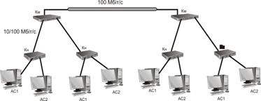 Частина абонентських систем з’єднуються з 10-мегабітними концентраторами стандарту10BASE-T. Ці концентратори, у свою чергу, з’єднуються з концентраторами, стандарту 100BASE-T і підтримують як 10-мегабітні лінії так і 100-мегабітні. Високопродуктивні абонентські системи і сервери приєднуються напряму до комутаторів 10/100. Ці комутатори у свою чергу з’єднані з концентраторами за допомогою 100-мегабітних ліній. В свою чергу магістраль формують 100-мегабітні концентратори. Із зовнішньою глобальною мережею вони з’єднані за допомогою маршрутизатора.