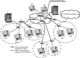 Рис. 3.15. Типова мережа організації з великою кількістю персональних комп’ютерів і абонентських систем, де: АС – абонентська система; С – сервер;