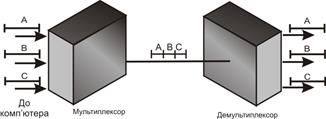 Мультиплексор (пристрій ущільнення) має п входів. Далі мультиплексор з’єднується одним каналом зв’язку з демультиплексором (пристроєм розущільнення). Канал зв’язку може містити п окремих інформаційних каналів. Мультиплексор поєднує (ущільнює) дані з п вхідних ліній і передає їх більш швидкіснім каналом зв’язку. Демультиплексор приймає ущільнений потік даних, розподіляє дані по інформаційних каналах і доставляє їх на відповідні вихідні лінії.