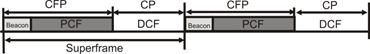 Режими DCF і PCF поєднуються в так званому суперфреймі, що утвориться з проміжку бесконкурентного доступу до середовища, називаного CFP (Contention-Free Period), і наступного за ним проміжку конкурентного доступу до середовища CP (Contention Period) (рис. 5.10).
