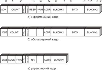 SOH – ознака інформаційного кадру; DLE – ознака обслуговуючого кадру; ENQ – ознака управляючого кадру; COUNT – довжина поля даних; CODE – код причини кадру; TYPE – тип управляючого кадру; RESP – номер останнього правильно прийнятого кадру; NR – номер підтверджувального або запитуваного кадру; NUM – циклічний номер кадру; ADDR – груповий номер; BLKCHK – контрольна сума заголовку, поля даних; DATA – поле даних; SYNC – синхронізація кінцевого устаткування; SELECT – вибір багатокрапкової конфігурації