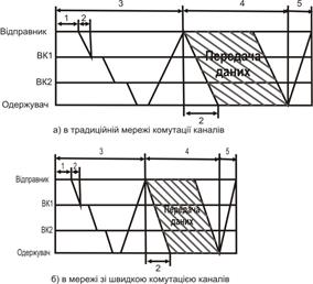 Процедуру передачі даних і часові затримки у мережах комутації каналів на базі телефонних мереж колективного користування зображено на рис. 7.1. Загальний час сеансу складається з часу комутації, часу передачі та часу завершення сеансу зв’язку. Слід звернути увагу, що процес комутації може істотно впливати на час сеансу. Наприклад, відносно тривалий час встановлення з’єднання (секунди) при використанні низькошвидкісних вузлів комутації каналів аналогових АТС у сукупності з низькою надійністю та високим рівнем шумів обмежує використання телефонних каналів зв’язку у швидкодіючих комп’ютерних мережах (рис. 7.1, а). Використання сучасних електронних вузлів комутації каналів дає можливість значно зменшити час комутації каналів і створювати так звані комп’ютерні мережі зі швидкою комутацією каналів, процедуру передачі даних в яких показано на рис. 7.1, б. Як видно з рис. 7.1, зі збільшенням розміру повідомлення, переданого за один сеанс обміну, ефективність даного способу комутації підвищується.