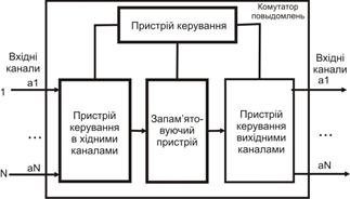 Передача інформації за допомогою так званої комутації повідомлень здійснюється без утворення фізичного з’єднання між відправником і одержувачем інформації. Між ними встановлюється віртуальне (логічне) з’єднання, а фізичний канал установлюється локально між суміжними вузлами комутації і тільки на час передачі даних. При цьому інформація передається одним блоком даних, який містить усе повідомлення. Заголовок блоку даних містить адреси відправника і одержувача інформації, а також іншу керуючу інформацію, потрібну для достовірної передачі повідомлень між абонентами. Передача блоків даних між абонентами здійснюється з проміжним запам’ятовуванням їх у вузлах комутації; тобто повідомлення, що надійшло до вузла комутації, запам’ятовується у буферному запам’ятовуючому пристрої, перевіряється і при відсутності помилок та наявності вільного каналу зв’язку передається цим каналом до наступного вузла в напрямку одержувача. Такі вузли (рис. 7.2), що здійснюють проміжне збереження і керування передачею повідомлень, називаються вузлами комутації повідомлень, а мережі передачі даних, що використовують такий спосіб комутації, — мережами комутації повідомлень.