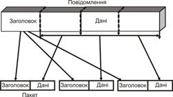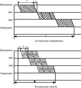 Фіксована довжина пакетів допускає розбивання довгих повідомлень на кілька пакетів, правило формування яких показано на рис. 7.4. Великі масиви інформації передаються кількома пакетами, але, на відміну від комутації повідомлень, операція складання-розбирання здійснюється тільки в абонентських системах, що спрощує структуру проміжних вузлів мережі. Природно, через дублювання керуючої інформації у кожному пакеті загальна довжина переданого повідомлення збільшується, проте, як буде показано далі, час передачі всього повідомлення не збільшується, а здебільшого навіть скорочується. Обмеження на довжину пакета дає можливість скоротити об’єм запам’ятовуючих пристроїв вузлів комутації, завдяки чому скорочується час перебування пакета у вузлі комутації і час передачі повідомлень у цілому, також підвищується пропускна здатність мережі. Як видно з рис. 7.5, при комутації пакетів час передачі інформації, порівняно з комутацією повідомлень, скорочується. Цьому також сприяє одночасна передача кількох пакетів одного повідомлення.