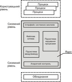 На структурному рівні операційна система має вигляд дворівневої моделі (рис. 13.3). На першому рівні, у центрі операційної системи, міститься ядро, що безпосередньо взаємодіє з апаратною частиною комп’ютера. Функціонально розташовуючись між апаратною частиною і прикладними програмами, ядро забезпечує необхідну незалежність операційної системи від апаратури. Ядро надає прикладним програмам набір сервісів, до яких належать: операції введення-виведення (відкриття, читання і запис файлів та керування ними), створення процесів і керування ними, їх синхронізація, операції міжпроцесорної взаємодії. Всі прикладні програми запитують сервіси ядра стандартно, використовуючи для цього механізм системних викликів.