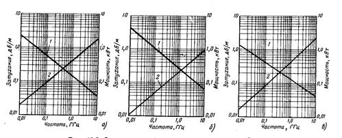 Зависимость коэффициента затухания α и передаваемой мощности Р кабелей от частоты приведена на рис. 19.3, 19.4. Кабели РК75-4-111 и РК75-4-112 имеют сопротивление связи на частоте 0,01 ГГц не более 1,0 МОм*м. Кабель РК50-7-11С имеет коэффициент стоячей волны напряжения (КСВН) в диапазоне частот 0,5 — 3,0 ГГц не более 1,15. В каждом диапазоне 0,5 — 1,5 и 1,5 — 3,0 ГГц допускается 10 максимальных значений КСВН более 1,15, но не превышающих 1,20.