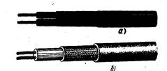 Жилы радиочастотных симметричных кабелей изготовляют из медной или медной посеребренной проволоки. Большинство симметричных кабелей имеет однопроволочные жилы, для повышения гибкости и вибростойкости кабели РД75-3-11, РД75-3-12, РД-15, РД-115, РДБ-82 и РДБО-82 изготовляют с семипроволочными жилами. Большинство симметричных кабелей имеет ПЭ изоляцию. Изолированные жилы кабелей оплетают медной проволокой диаметром 0,12 - 0,20 мм плотностью не менее 96%, в результате чего образуются индивидуальные экраны жил кабеля. Изолированные или изолированные экранированные жилы размещают параллельно и оплетают медной или медной посеребренной проволокой диаметром 0,06 - 0,20 мм плотностью не менее 96%, в результате чего образуется общий экран кабеля (рис. 19.16, а). Изолированные жилы размещают параллельно или скручивают. Для получения круглой формы кабеля промежутки между жилами заполняют ПЭ, Ф-4 или Ф-4М. Кабели РДБ-82 и РДБО-82 (рис. 19.16,6) изготовляют с общей изоляцией поверх параллельно уложенных жил (аналогично с кабелем, имеющим заполнение между жилами).