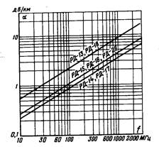 Рисунок 19.18. Зависимость α симметричных кабелей от частоты