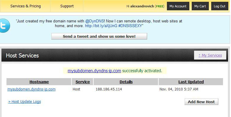 Примечание: бесплатный аккаунт на DynDNS позволяет создать не больше двух субдоменов.