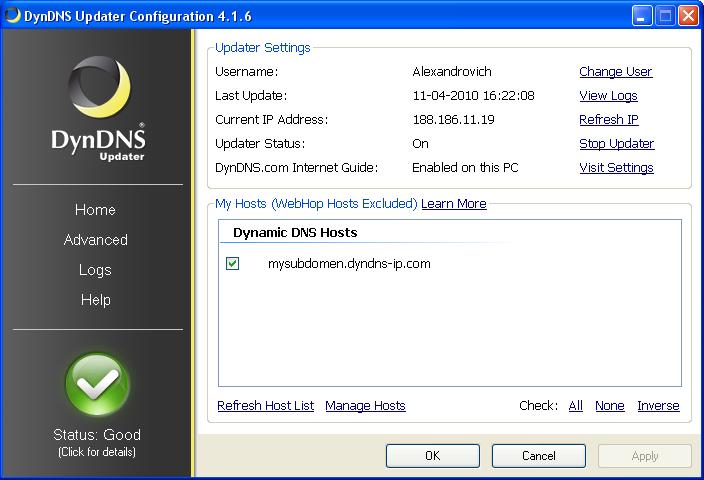 2. Если вы подключаетесь к интернету непосредственно с ноутбука или через модем/роутер который работает в режиме моста, а также если в вашем модеме/роутере нет встроенного DynDNS клиента ,то нужно воспользоваться специальной программой - DynDNS Updater cкачать.