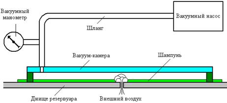 Вакуумно-жидкостный метод (рисунок 8) широко применяется при контроле герметичности днищ и стенок резервуаров для хранения нефти и нефтепродуктов. Средствами контроля являются электрический вакуумный насос, вакуумный манометр и вакуум-камера, представляющая собой лист толстого оргстекла со штуцером, обнесенный по контуру толстой полосой пористой резины. Насос, манометр и камера соединены между собой резиновыми шлангами. В качестве индикаторного средства используется жидкое мыло или обыкновенный косметический шампунь. Контролируемый участок объекта обильно покрывают слоем мыла, накрывают вакуум-камерой и откачивают из-под нее воздух. Степень вакуума должна быть не менее -0,75 кгс/см2. Если под камерой имеется сквозной дефект, то под действием внешнего атмосферного давления наружный воздух устремляется сквозь него в полость камеры, и над дефектом возникает вспенивание мыльного слоя, которое оператор хорошо видит сквозь прозрачную крышку камеры.