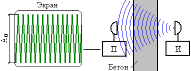 Сквозной (радиотеневой) метод относится к классу методов прохождения. Он состоит в том, что сквозь исследуемый объект пропускают поток радиоволн (см. рисунок 23-а). Если на пути потока в объекте имеется металлическое включение, оно оттеняет часть волнового потока, и амплитуда А сигнала на приеме падает относительно значения А0, полученного на свободном участке, что и является признаком присутствия металлического включения (см. рисунок 23-б).
