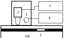 | Используют для контроля многослойных неметаллических и композитных материалов. Вибратором 2 к точке объекта контроля (ОК) прилагают колебания, вырабатываемые генератором 1. Ответные колебания принимают микрофоном 3. Индикатор 4 покажет резкое изменение колебаний при расположении вибратора над дефектом 5. | ||||||