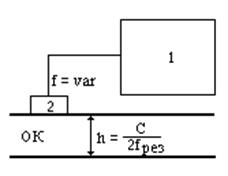| Толщиномер 1 посылает на преобразователь 2 колебания переменной частоты f. Когда частота достигает такого значения, при котором длина волны в ОК l=С/f=2h, объект входит в активный резонанс. Это значение частоты (резонансное) фиксируется, и по нему прибор определяет толщину ОК h (С - скорость звука в ОК). | ||||||