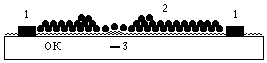 | Обширный участок поверхности ОК подвергают непрерывным колебаниям при помощи вибраторов 1 и покрывают алюминиевой пудрой 2. В зоне дефекта 3 вследствие резонанса колебания более активны, и поэтому оседание пудры - меньше. | ||||||