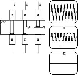 | Импульсные или непрерывные ультразвуковые волны пропускают сквозь плоский ОК от излучателя (И) к приемнику (П). Если между И и П дефектов нет, то волны проходят беспрепятственно, и на приеме - сигнал большой амплитуды (вариант I). Малый дефект (Д) оттеняет часть потока, и амплитуда на приеме падает (вариант II). Крупный дефект полностью перекрывает поток, обнуляя сигнал на приеме (вариант III). Глубина залегания и размеры дефекта аппаратурно не оцениваются. Необходим двусторонний доступ к ОК. | ||||||
