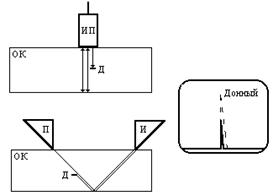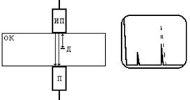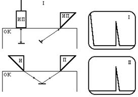 | В совмещенном I или раздельном II режиме работы аппаратуры импульс ультразвуковых волн посылается в ОК. Если на его пути встречается дефект, то импульс частично отражается от него и возвращается в преобразователь, образуя сигнал на приеме (эхо-сигнал). В раздельном режиме изображение посылаемого (зондирующего) импульса на экране отсутствует. | ||||||
