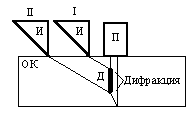 | Импульсы ультразвуковых волн пропускают сквозь плоский ОК от излучателя И к приемнику П. Если между И и П есть дефект Д средней величины, он оттеняет часть потока, а отклоняющиеся боковые лучи падают на его край, где претерпевают дифракцию. Попадая в приемник несколько позже прямого потока 1, дифрагированные лучи 2 образуют отдельный слабый сигнал. По разности времени прихода сигналов судят о размерах дефекта. Глубина залегания не определяется. Необходим двусторонний доступ к ОК | ||||||