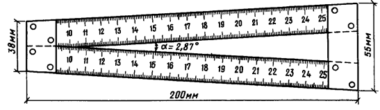 Погрешность определения прочности бетона на сжатие эталонным молотком составляет 10—15%. Для определения диаметра отпечатка на бетоне и эталонном стержне может быть применен угловой шаблон (рис. 2.2.12), позволяющий измерять диаметр с точностью до 0,1 мм.