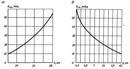 При испытаниях бетона удары наносятся не ближе 20 мм в осях и не менее 55 мм от оси ударника до края изделия. Градуировочные кривые строят для конкретных производственных условий с установившейся технологией на основе сопоставления результатов разрушающих методов испытания кубиков с данными, получаемыми прибором КМ. На рис. 2.2.14, а и б приведены примеры градуировочных характеристик при оценки прочности по отскоку и вдавливанию.