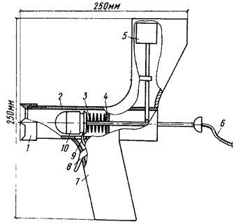 Основной частью прибора является полый цилиндр, внутри которого находится спиральная пружина 2. Внутри пружины помещен металлический стержень, вдоль которого перемещается боек 3. Прибор заканчивается ударником 1. Когда боек занимает правое положение, фиксируемое защелкой 7, он растягивает пружину 2 и сжимает возвратную пружину 9.