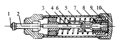 1 - шарик, 2 - ударник; 3 - боек, 4 - шток; 5, 9 - пружины; 6 – защелка; 7 - цилиндрический корпус; 8 - втулка; 10 - крышка
