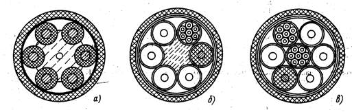 Коаксиальные пары и группы силовых, контрольных и сигнальных жил скручивают в кабель с заполнением промежутков между ними хлопчатобумажной или кабельной пряжей, обматывают ПЭТФ, лакотканевой или прорезиненными тканевыми лентами и оплетают медной или луженой медной проволокой диаметром 0,20 - 0,30 мм плотностью не менее 80%. Поверх экрана могут наматываться синтетические или тканевые ленты и накладываются ПЭ, ПВХ или резиновая оболочка (рис. 19.19,6).