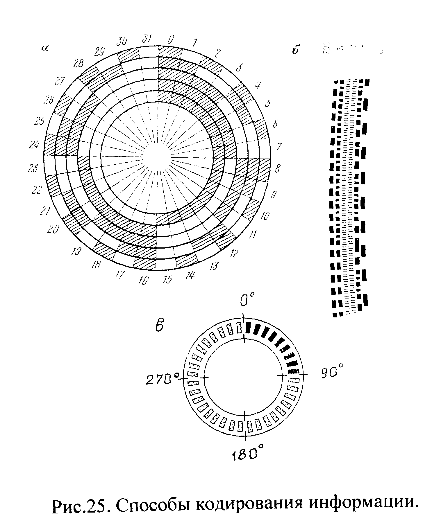 Рис. 30. Способы кодирования информации: а, б – кодирование угломерной шкалы; в – импульсные диски