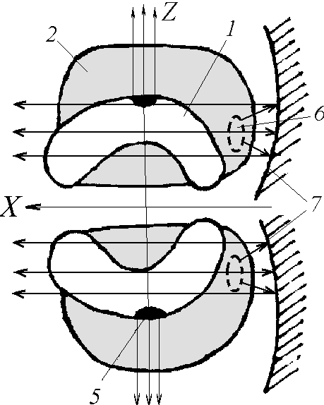 Измерительная структура состоит из тонкой упругой мембраны 4, разделяющей полость на две камеры. В одну из них поступает из вне ИК-излучение, направленное зрачком 3. Вторая полость 6 – замкнутая, тепловые излучения ее стенок создают внутри нее определенный равномерно рассеянный фон ИК-излучения, зависящий от температуры тела животного. Это излучение используется в качестве меры в процессе измерения. Оба потока излучений воспринимаются рецепторными клетками 5, которые располагаются внутри мембраны.