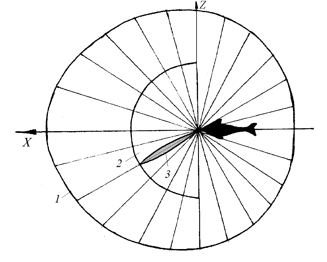 Учитывая особенности работы акустической ОСС зубатых китов, можно сказать, что эти животные имеют две области звуковидения (рис. 20.б): дальнюю и ближнюю. Дальняя область форму сферы, которая распространяется во все стороны от его головы. Ближняя область занимает верхний передний сектор кругового обзора. Она образована высокочастотными звуковыми сигналами (ультразвуками), которые излучаются в виде узко направленного луча, сканирующего в горизонтальной плоскости. Направление и длина луча, скорость и угол его сканирования регулируется животным в зависимости от расстояния до пеленгуемого объекта. В пределах этой области акустический глаз распознает объекты, выполняет задачи измерения параметров ориентиров, слежения за целями и детального анализа акватории.