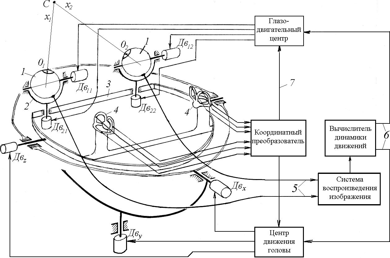 В данной системе имеется два контура управления движениями глаз: слежения и стабилизации.