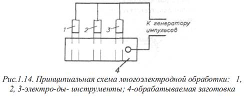 Повысить производительность можно расположив параллельно несколько электродов-интрументов, если они подключены к одному генератору импульсов – это многоэлектродная обработка, если каждый электрод имеет свой источник питания, то это многоконтурная обработка (рис. 1.14).