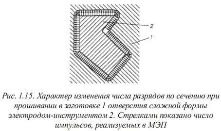При ЭЭО износ электрода-инструмента в разных участках разный. На рисунке 1.15 показано изменение числа разрядов по сечению при прошивании в заготовке 1 отверстия сложной формы электродом-инструментом 2. Возможное число импульсов в МЭП показано стрелками.