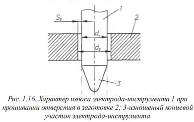 Видно, что возможное число импульсов в местах сопряжения поверхности отличается от прямолинейных участков. На участках электрода-инструмента, имеющих вогнутость число разрядов меньше и износ на них будет меньше. Таким образом в процессе обработки форма и размеры электрода-инструмента в результате износа нарушается. Так как окончательный профиль углубления формируется не изношенными участок электрода-инструмента, то электрод-инструмент выполняет на 1-2 квалитета точнее, чем обрабатываемая деталь. Износ электрода-инструмента 1 при прошивании отверстия в заготовке 2 показан на рисунке 1.16.