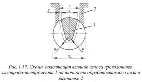 При вырезании заготовок проволокой ее износ не влияет на время, но уменьшение диаметра проволоки уменьшает ее прочность, снижает способность сохранять прямолинейность, при обработке, то есть снижает точность формы и размеров детали. При обработке узких пазов износ проволоки существенно влияет на точность размеров (рис. 1.17).