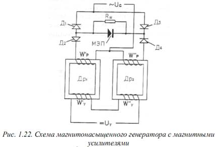 Магнитонасыщенные генераторы (рис. 1.22). В сравнении с ламповыми обеспечивают более высокую энергию импульса. Наиболее распространены генераторы с магнитными усилителями. Они просты и надежны в работе, однако, частота следования импульсов зависит от частоты питающего сетевого напряжения и не превышает 150 Гц, что применимо только для черновой обработки на грубых режимах.