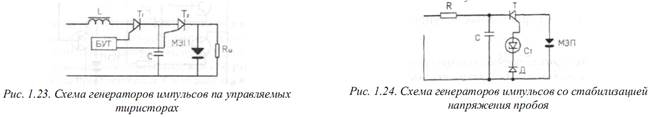 Полупроводниковые генераторы. Они имеют более широкий диапазон режимов обработки, у которых частота следования импульсов не зависит от свойств МЭП. Бывают генераторы на основе инверторов (рис. 1.23) и широкодиапазонные генераторы импульса. Недостаток первых это непостоянство напряжения пробоя, что приводит к изменению режима обработки. Для стабилизации напряжения пробоя применяют схемы с стабилитроном (рис. 1.24).