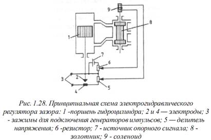 · Электрогидравлические (рис. 1.28). Импульсный ток от генератора через зажимы 3 поступает на электроды 2 и 4, напряжение с которых снимается через делитель напряжения 5. Полученный сигнал сравнивается с сигналом на резисторе 6, подключенном к опорному источнику 7. Полученный таким образом управляющий сигнал поступает на обмотку соленоида 9, перемещающего золотник 8. В результате масло под давлением поступает в верхнюю или нижнею часть гидроцилиндра, перемещая поршень 1 со штоком которого связан электрод-инструмент 2. Преимущества регулятора отсутствие люфтов. Недостаток – высокая стоимость изготовления и сложность наладки.