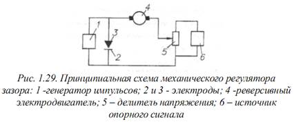 · Электромеханический регулятор зазора (рис. 1.29). От генератора 1 импульсы напряжения поступают на электроды 2 и 3, параллельно которым подключена часть делителя напряжения 5. Сюда же поступает напряжение от источника 6 опорного сигнала. Если между сигналами с электродов и источника 6 возникнет различие, то через обмотку двигателя 4 потечет ток и якорь придет во вращение, направление которого зависит от знака разностного напряжения. Якорь механически связан с микровинтом, который поступательно перемещает гайку, жестко связанную с электродом-инструментом.