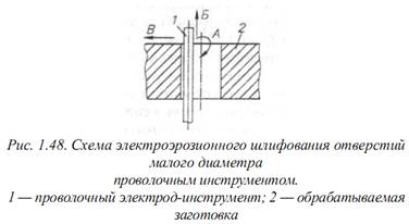 Шлифование мелких отверстий проводят проволочным электродом-инструментом. Его вводят в предварительно полученное отверстие на заготовке 2 (рис. 1.48), и начинают вращать по стрелке А. Электрод 1 и заготовку 2 подключают к генератору импульсов. Перемещая проволоку перпендикулярно ее оси (по стрелке В) регулируют диаметр отверстия, а за счет непрерывной перемотки проволоки (по стрелке Б) исключают влияние износа на точность отверстия.