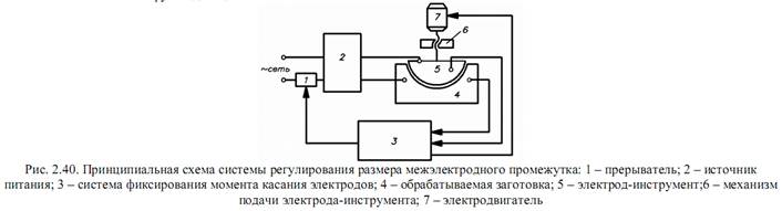 Механизмом подачи 6 электрод-инструмент 5 перемещается к заготовке 4. Через некоторое время прерыватель 1 отключает источник питания 2 после чего электроды 4 и 5 сближают до касания, которое фиксируется системой 3 автоматического регулирования. От нее поступает сигнал на электродвигатель 7 механизма подачи 6. По этому сигналу электрод-инструмент 5 отводится от заготовки 4 на заданный размер МЭП. После этого от блока 3 поступает сигнал в прерыватель 1 на включение источника питания 2 и процесс обработки возобновляется.