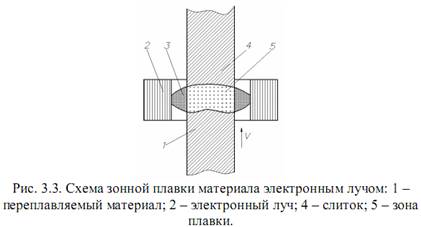 Для многократного переплава заготовку 1 (рис. 3.3) вводят внутрь кольцевой электронной пушки 2, которая лучом 3 проводит локальный переплав заготовки. Материал, выйдя из зоны плавки 5 кристаллизуется, образуя слиток 4 с улучшенными характеристиками.
