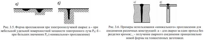 При небольших значениях удельной поверхностной мощности форма проплавления напоминает газовую или дуговую сварку (рис. 3.5.а). При увеличении удельной поверхностной мощности происходит интенсивное испарение металла, его деформация в жидком состоянии под действием паров, приводя к получению «кинжального» проплавления (рис. 3.5.б). Такое проплавление толщиной до 100 мм позволяет получать принципиально новые сварные соединения (рис. 3.6). Использование вакуума улучшает показатели сварного шва для вольфрама, молибдена, титана и так далее (рис. 3.7).