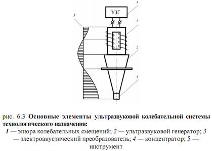 Состоят из преобразователя 1, концентратора 2 и рабочего инструмента 3. Электроакустический преобразователь 1 передает колебания согласующему элементу 2, который называется концентратором или трансформатором упругих колебаний. К нему крепятся рабочий инструмент 3. Питание электроакустического преобразователя осуществляется от ультразвукового генератора 4.